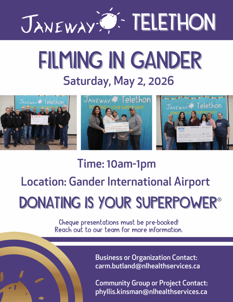 The Janeway will be conducting filming for this year’s telethon at the Gander International Lounge from 10 am – 1 pm on May 2. If you’re interested in taking part and fundraising for the janeway this year, please keep reading.