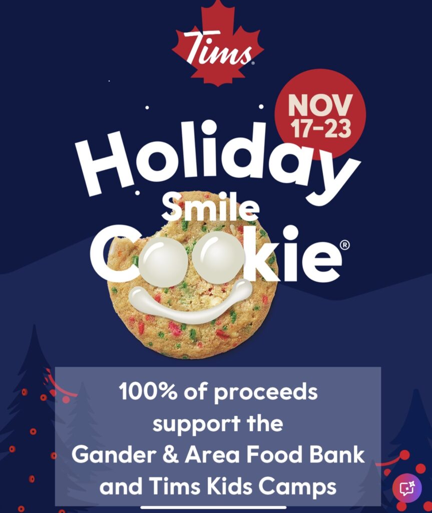 The Gander and Area Food Bank has partnered with Tim Hortons to provide Holiday Smile Cookies for this Festive season. 100% of proceeds go to supporting our local Food Bank as well as Tim’s Kids Camps. Smile cookies can be bought directly in store, and they can be pre-purchased in bundles of 12 or more in advance. Please see this PDF to Order your cookies in advance: